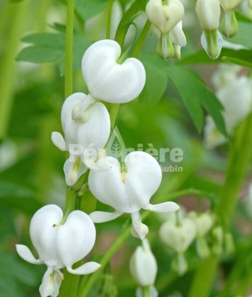 Aussi connue sous le nom de Cœur-de-Marie blanc, est une plante vivace gracieuse reconnue pour ses fleurs blanches en forme de cœur qui pendent le long de tiges arquées au printemps. Son feuillage vert tendre et finement découpé met en valeur la pureté de sa floraison. Après la floraison, le feuillage peut jaunir et disparaître en été, ce qui est normal.Pour l’entretien, rabattez les tiges fanées à la fin de la floraison et protégez la souche avec un paillis en hiver dans les régions très froides.