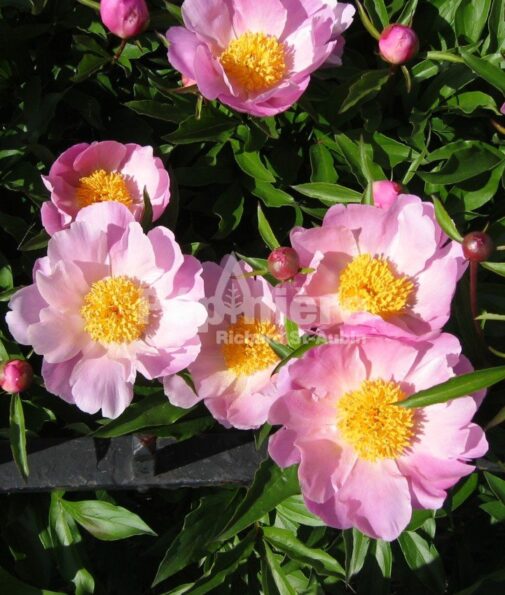 Cette pivoine herbacée élégante et délicate se distingue par ses grandes fleurs rose pâle à cœur jaune, très parfumées, qui apparaissent en fin de printemps. Son feuillage vert foncé, dense et finement découpé crée un joli contraste avec la floraison et reste décoratif tout au long de la saison. Supprimez les fleurs fanées pour prolonger la floraison et taillez le feuillage à la base en automne après le dessèchement pour préparer la plante à l’hiver. Un paillis autour de la base protège les racines du froid et conserve l’humidité du sol.